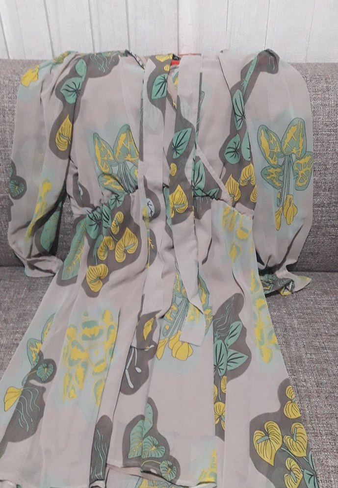 Gri renkte, uzun kollu ve salaş kesim bohem elbise Sentetik kumaştan, drapeli ve renkli baskılı desenli, günlük kullanım için uygun.beli lastikli ve kendi kuşağı var L bedene de uygun salaş giymek isteyen biri için M bedenli birine de olur