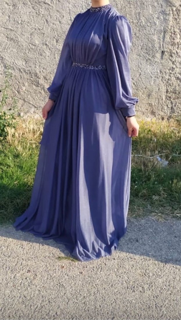 Uzun kollu, bol kesim ve drapeli bu abiye elbise, tek renk ve tekne yaka detayına sahip. Bohem ve sade tarzıyla düğünler için uygun mavi-gri tonlarında.