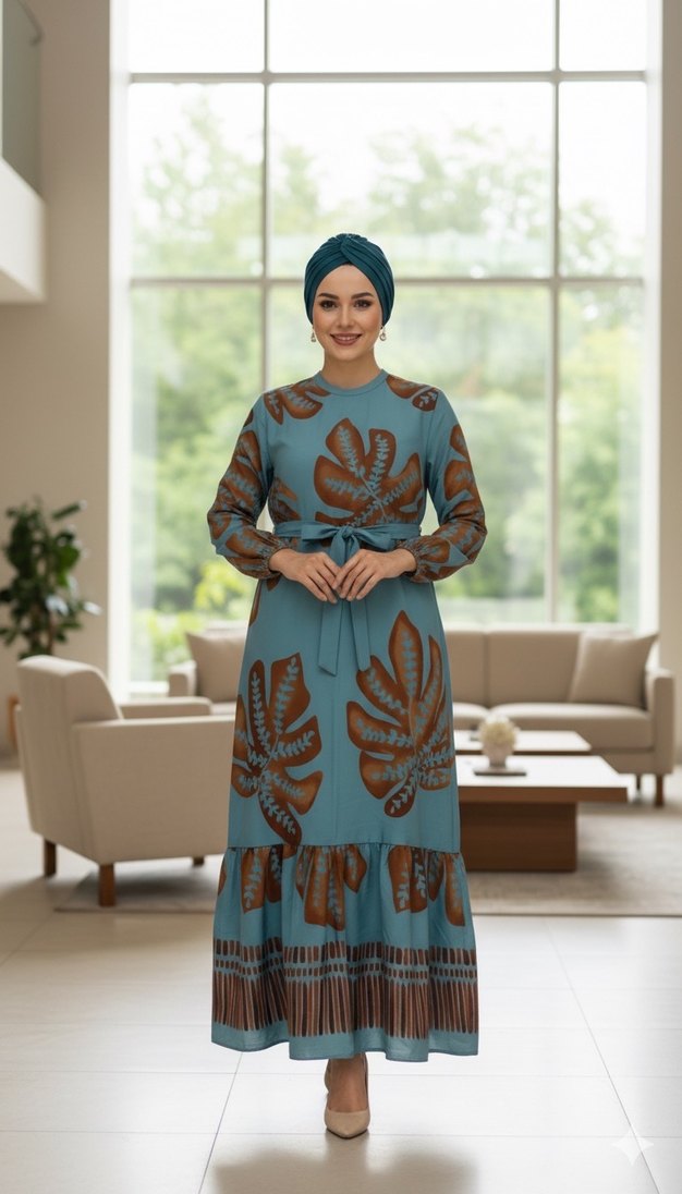 Bohem tarzda, uzun kollu, yuvarlak yaka ve bol kesim olan bu uzun elbise, sentetik yumuşak kumaştan ve kahverengi tonlarında yaprak desenli tie-dye desenlidir.