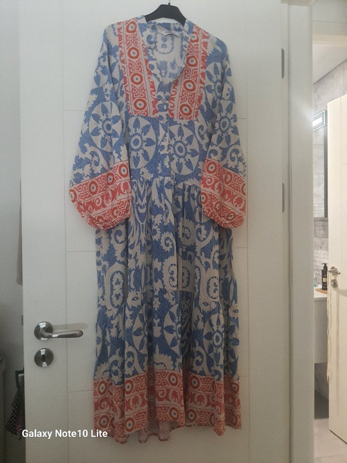 Diger markalı, uzun kollu, V yakalı, bol kesim, mavi ve gri tonlarda batik desenli uzun elbise. Püskül detayları ve bohem tarzıyla günlük kullanıma uygundur.