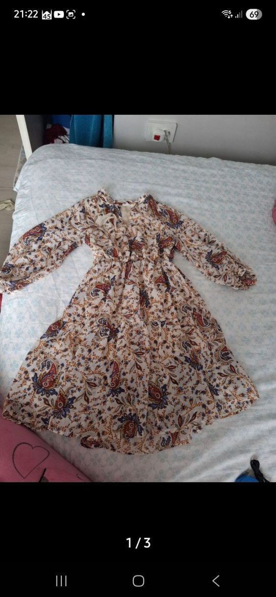 uzunluk 70 cm dir.......... Bohem tarzda, uzun kollu, V yakalı, düğmeli, hafif kahverengi baskılı sentetik kumaştan bol kesim elbise.
