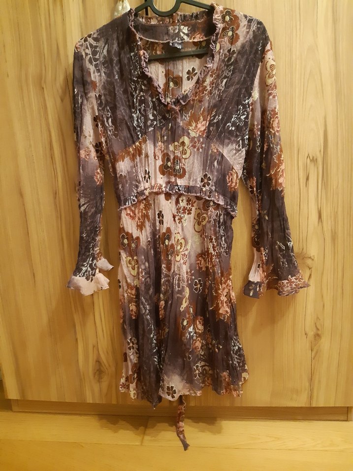 Bohem tarzda, uzun kollu, V yakalı, pileli detaylı bol kesim tunik. Kahverengi ve gri tonlarda batik desenli, sentetik kumaştan üretilmiştir.