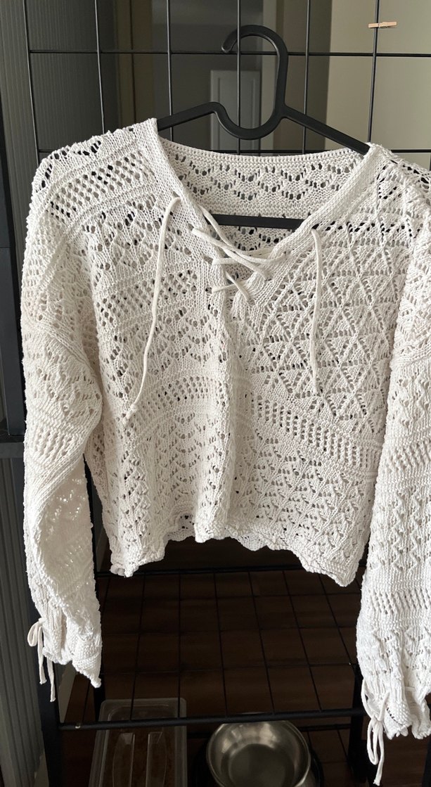 Örgü dokulu, bol kesim ve V yakalı kadın kazak. Uzun kollu, rahat ve bohem tarzda, beyaz renkte, günlük kullanıma uygun.