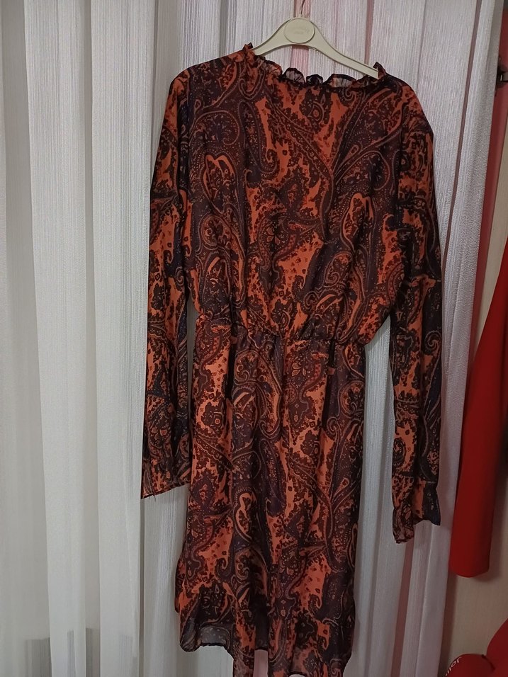 Bohem tarzda, kahverengi yılan desenli uzun kollu ve yüksek yakalı elbise. Salaş kesim ve drapeli detaylara sahiptir, günlük kullanım için uygundur. şifon kumas.