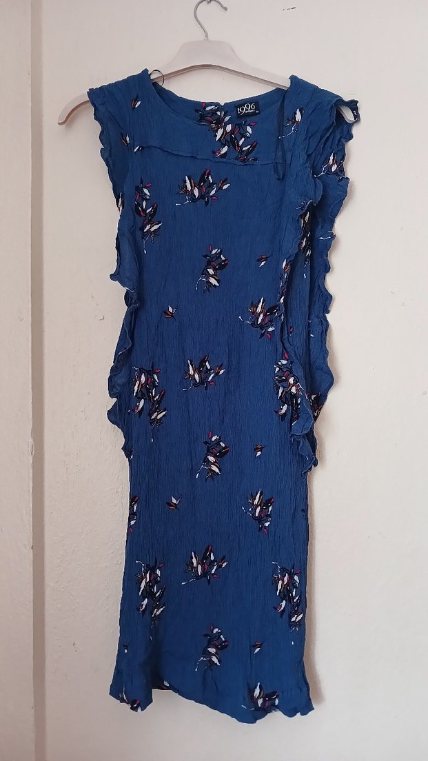 Kolsuz, uzun boy elbise yüksek yakalı ve bol kesimlidir. Sentetik kumaştan yapılmış, koyu mavi batik desenli, bohem stilde bir tasarımdır.