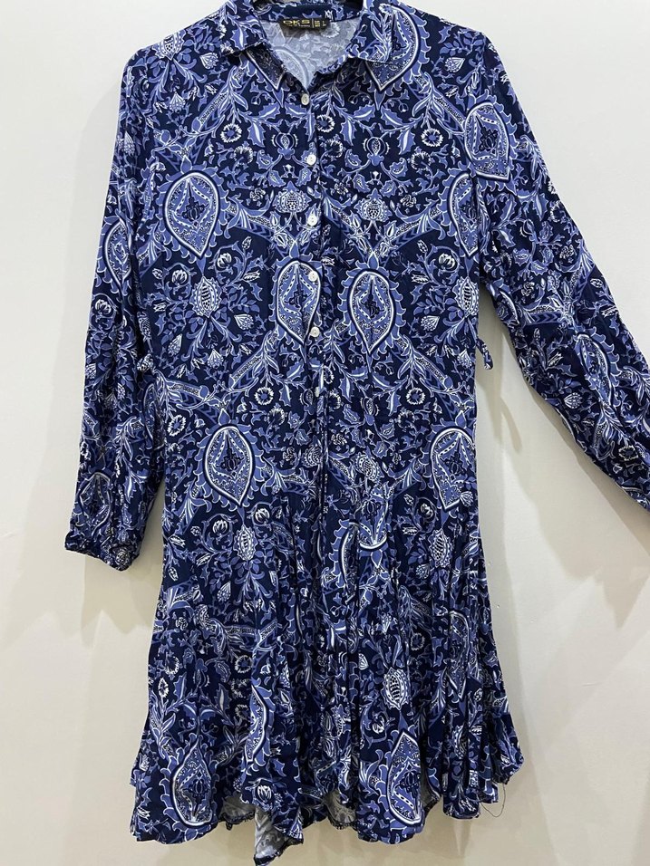 Bohem tarzda, lacivert tonlarında renkli paisley desenli, yakalı, uzun kollu, düğmeli ve bol kesim uzun elbise.