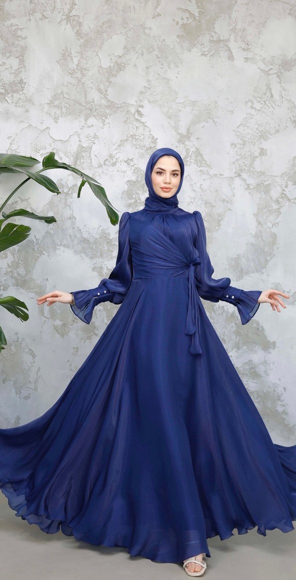 Bohem Uzun Lacivert Tesettür Abiye