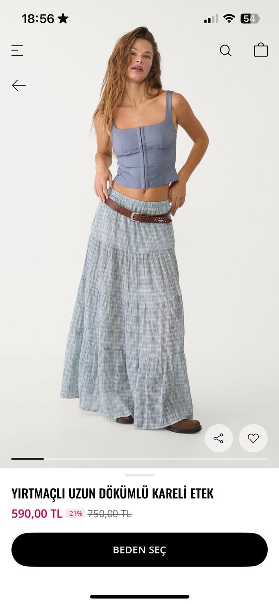 Bohem tarzda, kemerli ve bol kesim midi uzunluğunda kot etek. Gri ve mavi tonlarda batik desenli, rahat günlük kullanıma uygun.