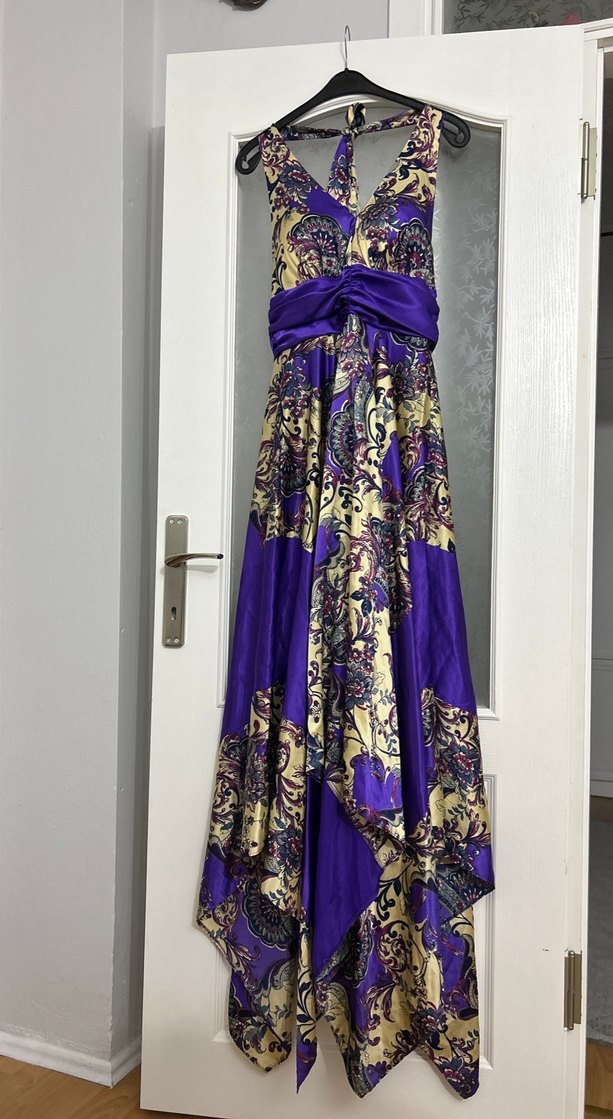 Uzun, askısız ve bol kesim olan bu elbise, mor desenli ipeksi kumaşı ve drapeli detaylarıyla düğünler için uygundur.