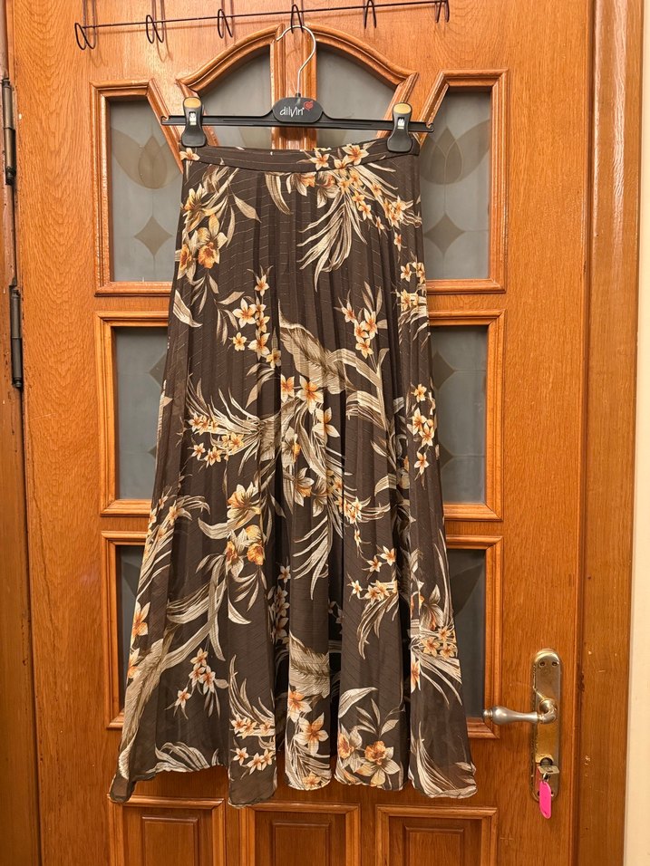 Kadınlar için bol kesim, pilili, koyu kahverengi çiçekli tie-dye desenli uzun etek, sentetik kumaştan yapılmıştır.