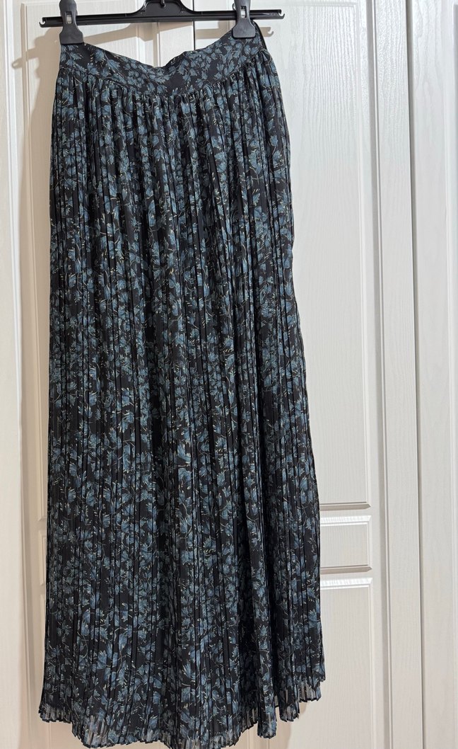 Uzun boy, pilili ve koyu mavi batik desenli, bol kesim etek. Yumuşak sentetik kumaştan, bohem tarzıyla ofis kullanımı için uygun.