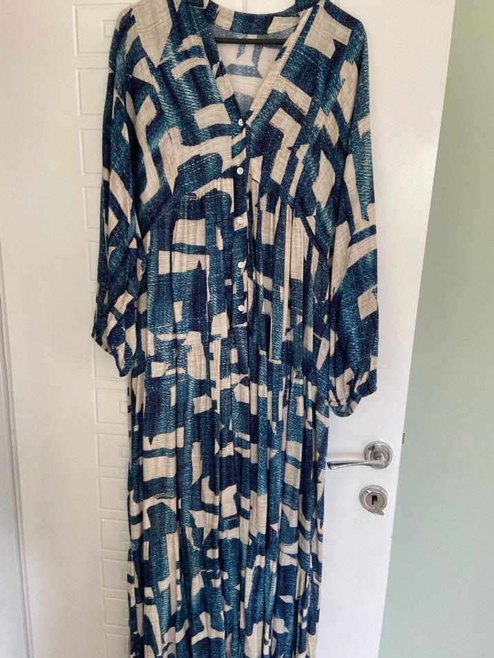 Mavi ve gri renklerde, pilili uzun elbise. Bol kesim, V yakalı . Bohem tarzda, yumuşak keten kumaştan yapılmıştır. Az kullanıldı hiçbir sıkıntısı yok