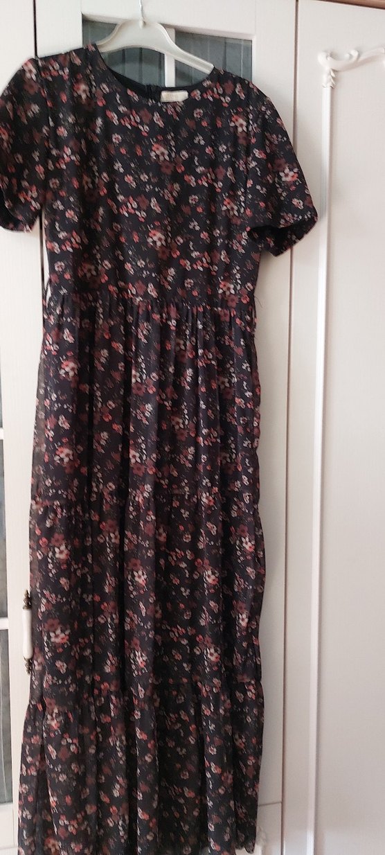renkte, yüksek yakalı, kısa kollu, piliseli detaylı, bol kesim uzun elbisedir. Koyu çiçekli tie-dye deseniyle bohem tarzı sunar.