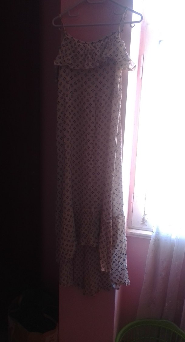 Bej ve mavi tonlarda bağlama desenli, uzun, salaş kesim ve dökümlü, ipeksi dokulu bohem tarzda etek.