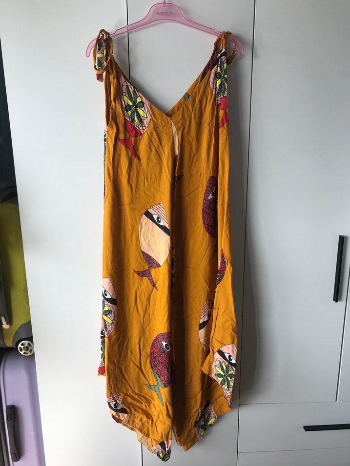 Bohem tarzda, askısız yakalı ve renkli batik desenli, bol kesim uzun tulum. Yumuşak dokulu kumaştan, drapeli detaylı, günlük kullanıma uygun.