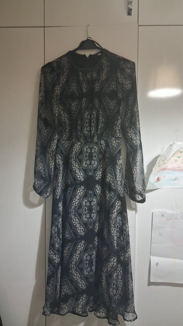 Uzun siyah elbise, desenli, uzun kollu ve bisiklet yaka detaylıdır. Sentetik kumaştan,kalibi dar kesim ve drapeli bohem tarzda tasarlanmıştır. xs bedenede uygundur. İç göstermez astarı vardir. temiz üründür. iki kere giyildi. duruşu yoktur. etek kısmı dar klos şeklindedir. Her şekilde kombinleyeceginiz şık bir üründür.