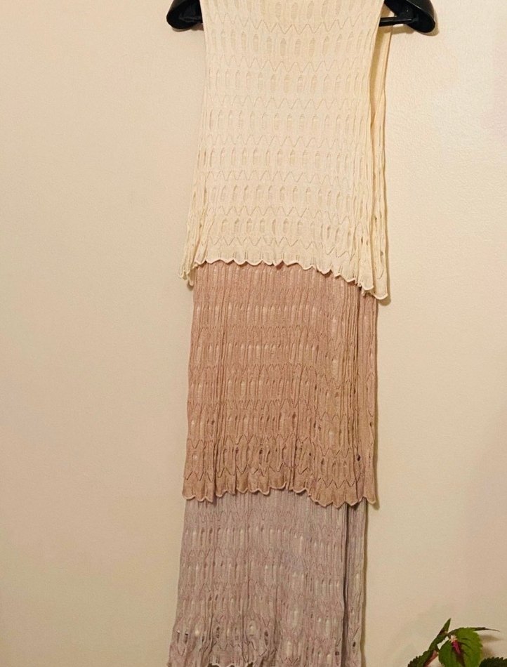 Vakko Triko Renk Geçişli Maxi Elbise – Zarif ve Romantik Tarz Zarafet arayanlara özel bir Vakko klasiği Krem, bej ve açık gri tonlarının yumuşak geçişleriyle tasarlanmış bu triko elbise, hem gündüz hem özel davetlerde sade ama şık bir duruş yaratır. İnce işçilik, delikli triko dokusu ve zarif üç kat geçişli formuyla tam bir sofistike bohem havası taşır. Marka: Vakko • Renk: Krem / Bej / Açık Gri • Model: Uzun, katmanlı triko elbise • Beden: Belirtilmemiş (36-38 uyumlu) • Durum: Kullanılmış, genel olarak iyi durumda (birkaç küçük leke mevcut – fotoğraflarda gösterilmiştir) • Kumaş: Yumuşak ve esnek dokulu triko Gardırobuna zarif bir dokunuş katmak isteyenler için eşsiz bir parça #vakko #vakkokadın #vintagemoda #zarifstil #trikoelbise #renkgeçişli #bohemzarafet #özelkoleksiyon #lüksmarka #dolapmoda