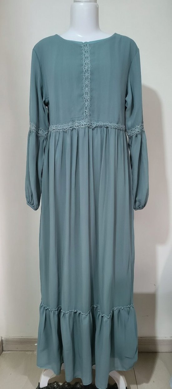 Bu turkuaz uzun elbise, yüksek yaka, uzun kollu ve nakışlı detaylara sahip, fırfırlarla süslenmiş bohem tarzda, rahat ve günlük kullanım için uygundur.