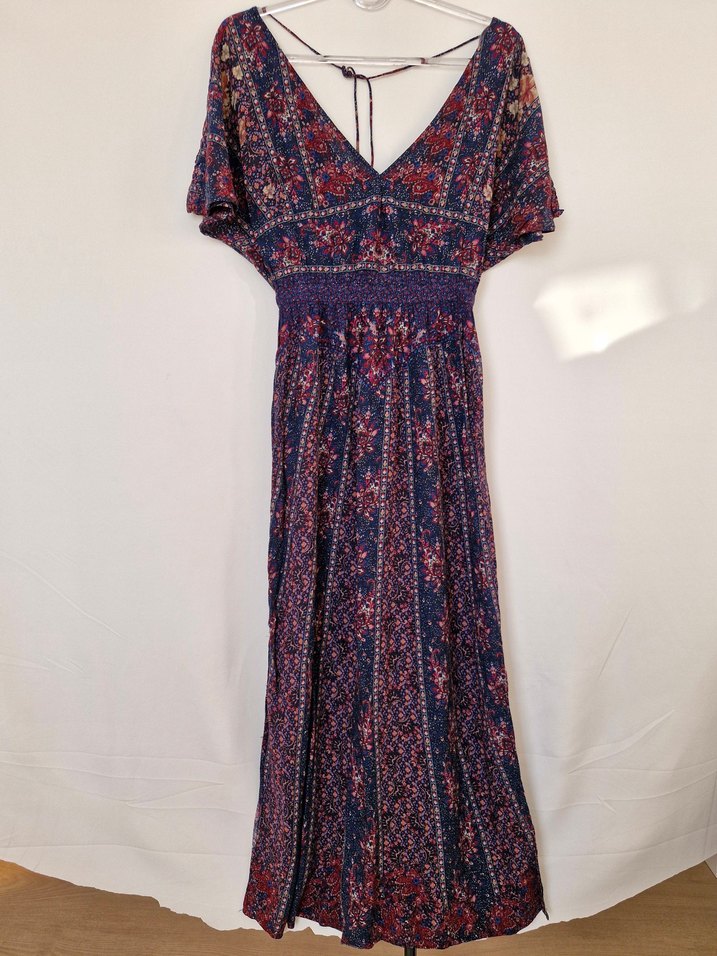 Bohem tarzda uzun, V yakalı ve askılı kollu yazlık elbise. Pamuklu kumaştan, tiril tiril ve çok şık duruyor yaz günlerinde. Lacivert üzeri çiçek desenli koyu dokuma kumaş, bol kesim. Sırt kısmı da V kesim ve ipli bağlama detayı var. Iki yanda dize kadar yırtmacı var.