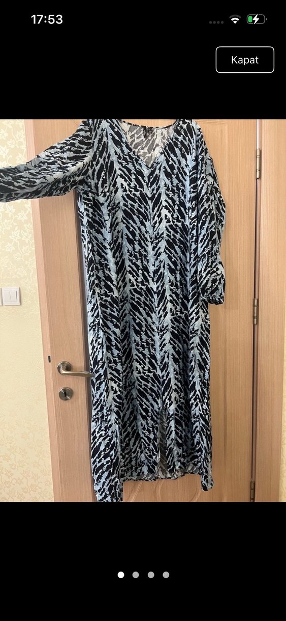 Gri zebra desenli, uzun ve bol kesim bu elbise, drapeli tasarımı, uzun kollu ve V yakasıyla bohem tarz sunar.