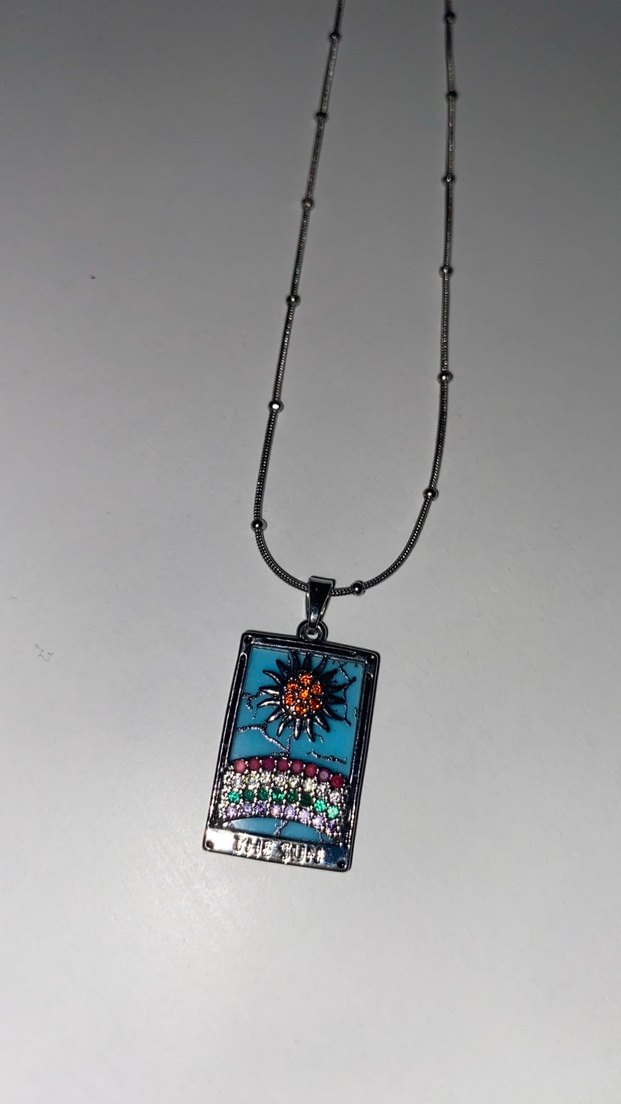 Uzun, koyu renkli zincirli kolye, çok renkli tie-dye desenli ve güneş figürlü detaylı dikdörtgen kolye ucu ile günlük kullanıma uygun.