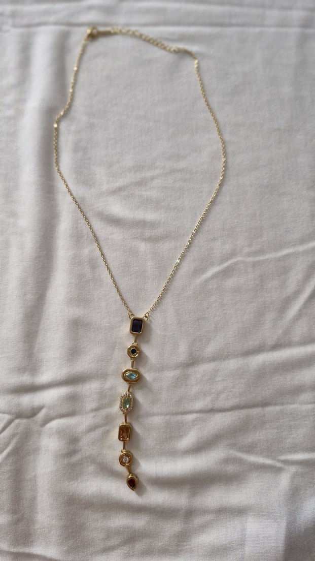 Uzun ve detaylı zincirli, çok renkli koyu tonlu taşların yer aldığı bohem tarzda kolye. Romantik akşamlar için uygun.