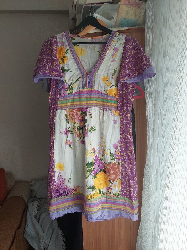 Bohem tarzda, V yakalı ve kısa kollu, bol kesim hamile tunik. Pastel mor tie-dye ve çiçek desenli, drapeli tasarıma sahiptir, günlük kullanıma uygundur. tülbent kumaş