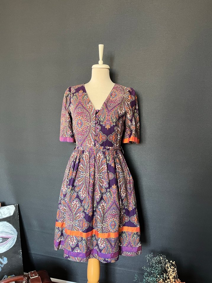Renkli bağlama desenli, V yakalı ve düğmeli uzun, bol kesim elbise. Kısa kollu, günlük kullanıma uygun bohem tarzda.