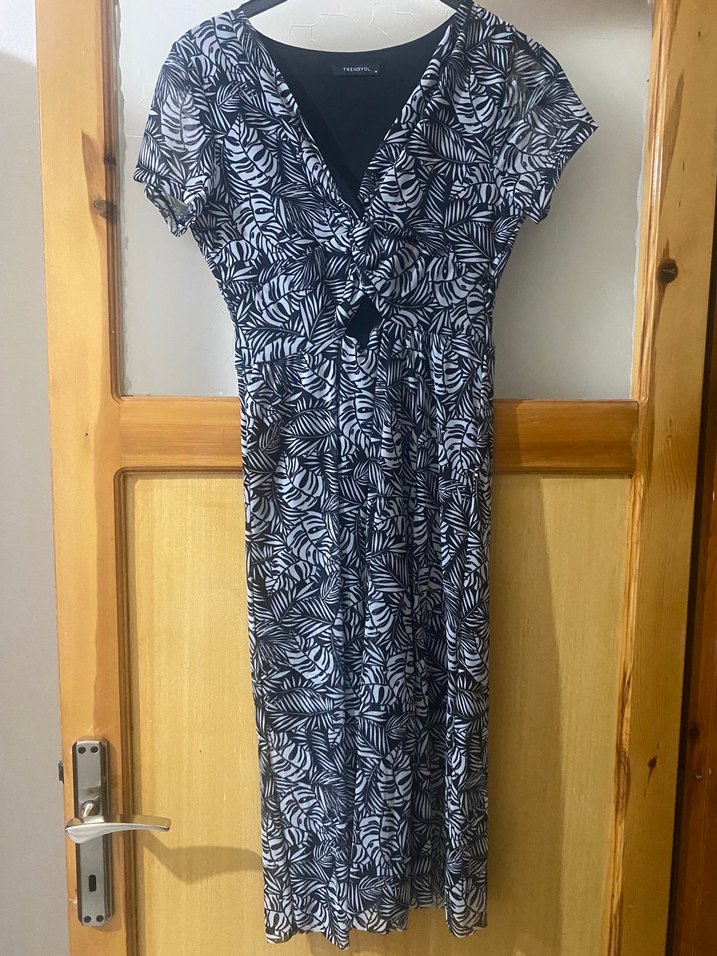 Lacivert ve gri bağlamalı elbisesi, kısa kollu ve V yakalı, bol ve rahat kesimli. Günlük kullanım için bohem tarzında.