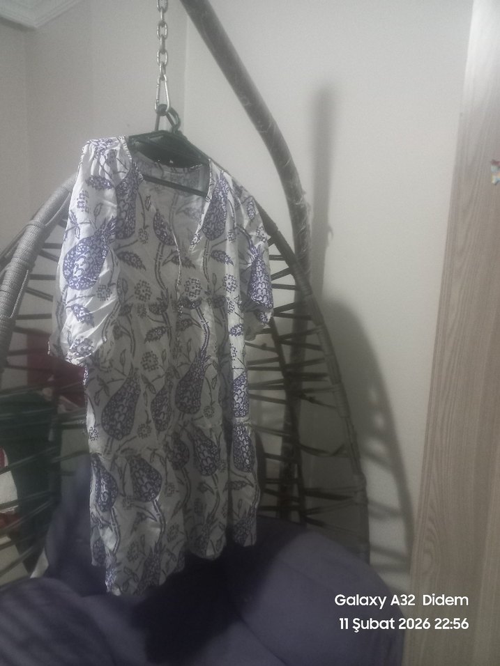 Bohem tarzı, bol kesim, drapeli uzun hamile tunik. V yaka ve kısa kolludur. Mor ve gri tonlarda batik desenli, yumuşak kumaştan yapılmıştır. Günlük kullanıma uygundur.