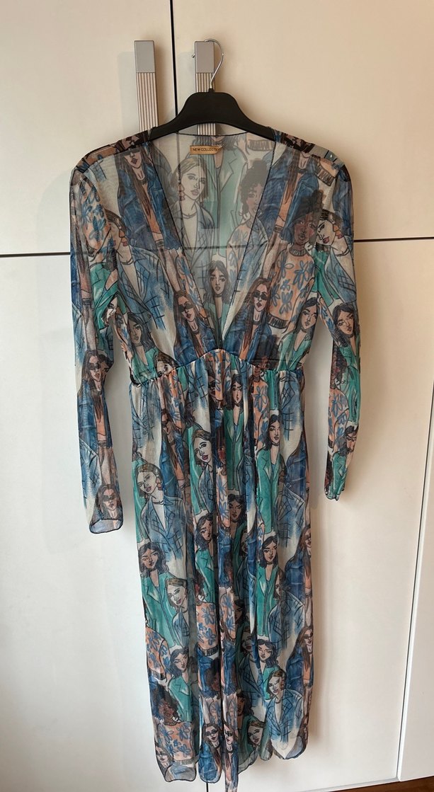 Turkuaz ve gri renklerde, bol kesim ve drapeli detaylara sahip uzun elbise. V yaka ve uzun kollu, baskılı tekstil ile bohem tarzını yansıtır.