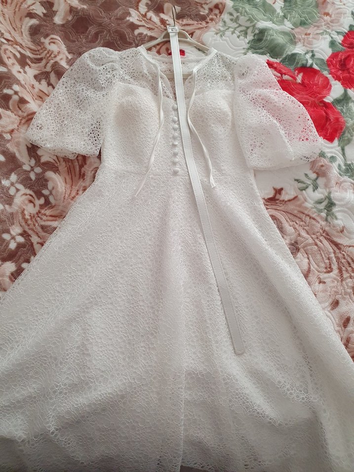 V yaka, kısa balon kollu beyaz A kesim abiye Gevşek kesimi ve vintage dantel dokusu ile bohem tarzda, düğmeli ön detaylı. sadece 1 kez giyildi