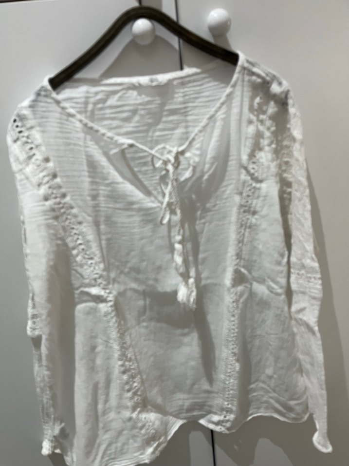 V yaka ve uzun kollu, bol kesim beyaz keten bluz. Nakış ve dantel detaylarıyla bohem tarzını yansıtıyor. Günlük kullanım için uygundur.