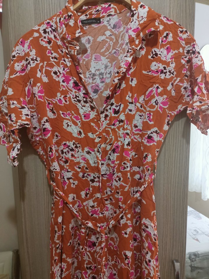 Bu uzun turuncu pembe çiçekli elbise, kısa kollu, V yakalı ve bol kesimdir. Pastel çiçek desenli ve düğmeli, yumuşak sentetik kumaştan yapılmıştır. Bohem tarzı için uygundur. İki yan tarafında da yırtmaç vardır ürünlerimde pazarlık payı vardır