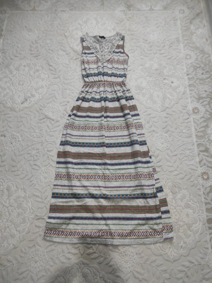 Bohem tarzda, pastel çok renkli batik desenli, dantelli ve kolsuz uzun elbise. V yakalı ve bol kesim, günlük kullanım için uygundur.