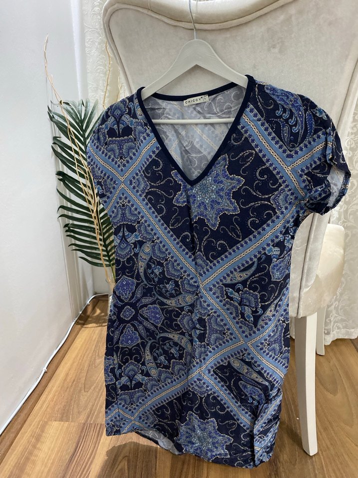Koyu mavi renkli, V yakalı, kısa kollu elbise s bedene de uygundur beline kemerle kullandım