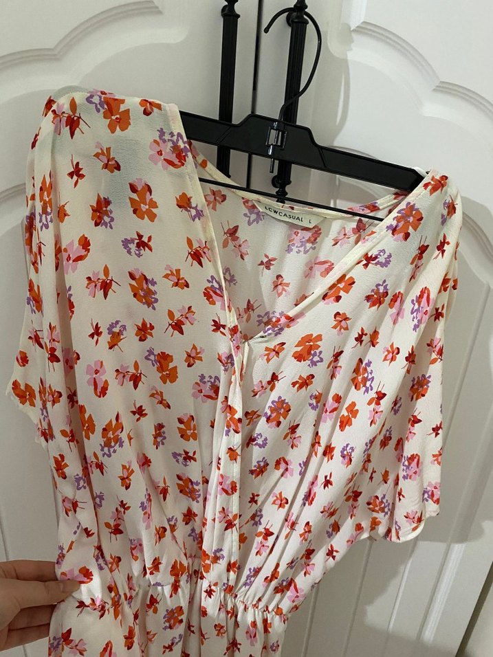 V yaka ve askılı kollu, bol kesim hamile bluzu. Beyaz zemin üzerinde renkli çiçek desenli, yumuşak sentetik kumaştan yapılmıştır.
