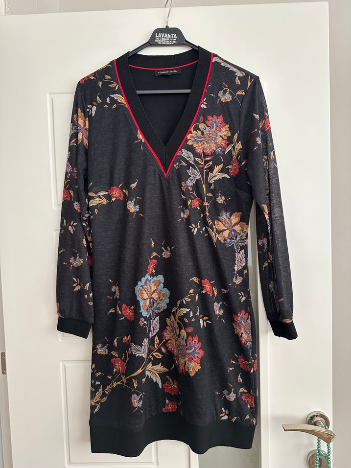 Bohem tarzı, V yaka ve uzun kollu, drapeli, bol kesim tunik. Koyu gri üzerine renkli çiçek desenli, günlük kullanım için uygundur.