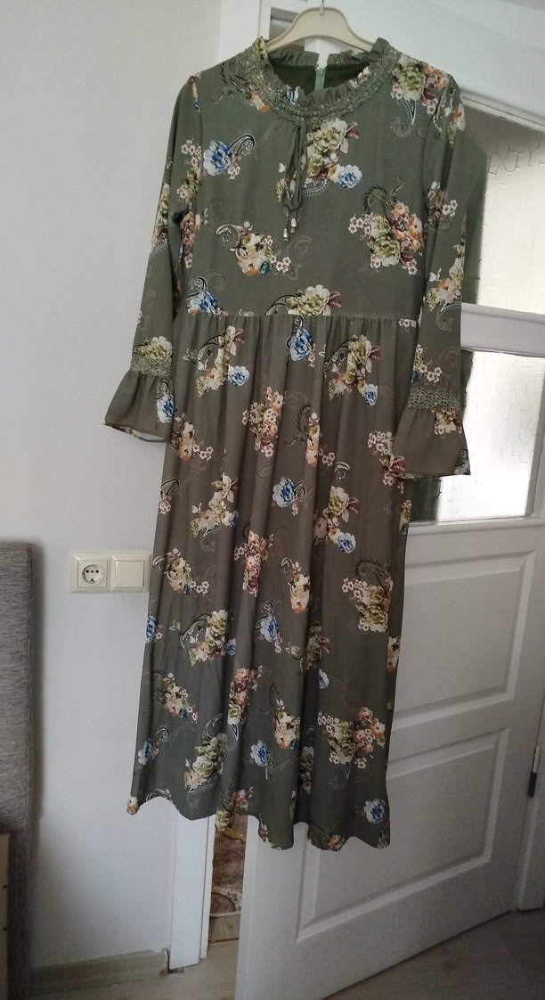 Bol kesim, V yakalı uzun elbise. Çiçek desenli, kollarında fırfır detaylı. Yumuşak sentetik kumaştan, haki renkte, günlük kullanıma uygun.