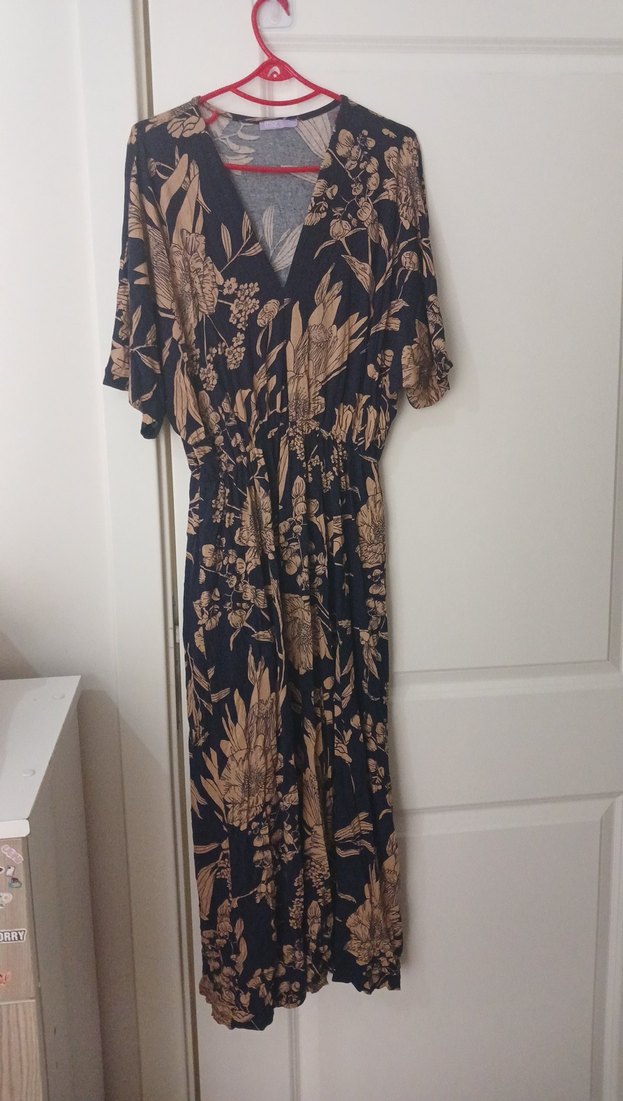 Koyu kahverengi desenli, yumuşak sentetik kumaştan yapılmış uzun ve bol kesim elbise. Drapeli tasarıma, V yaka ve kısa kollara sahiptir.