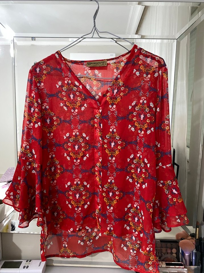 Renkli tie-dye desenli, V yakalı, uzun kollu, düğmeli bol kesim kadın bluz. Sentetik kumaştan, günlük kullanıma uygun.