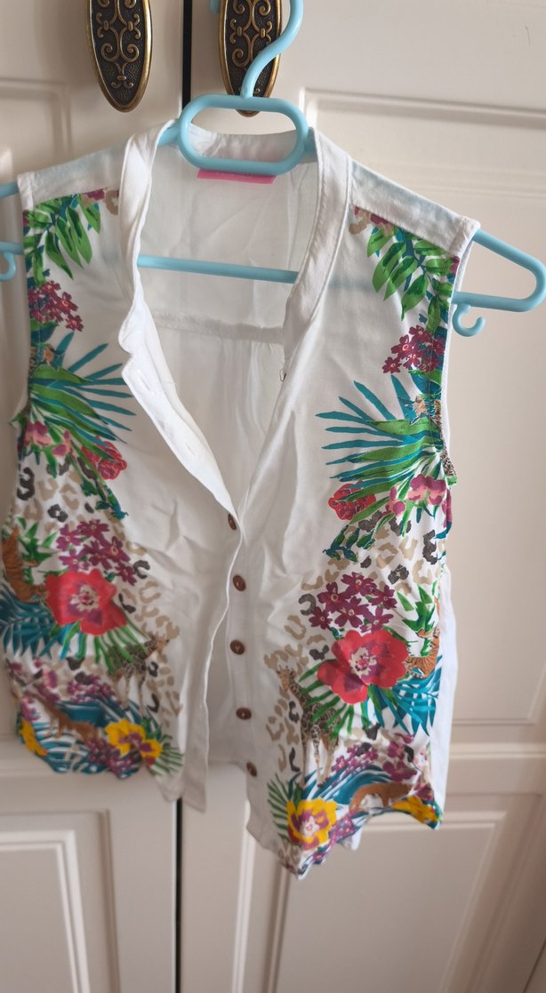 Düğmeli, V yakalı, beyaz renkli ve canlı çiçekli desenlere sahip kolsuz gömlek. Bol kesim ve midi boy ile bohem tarzını yansıtır.
