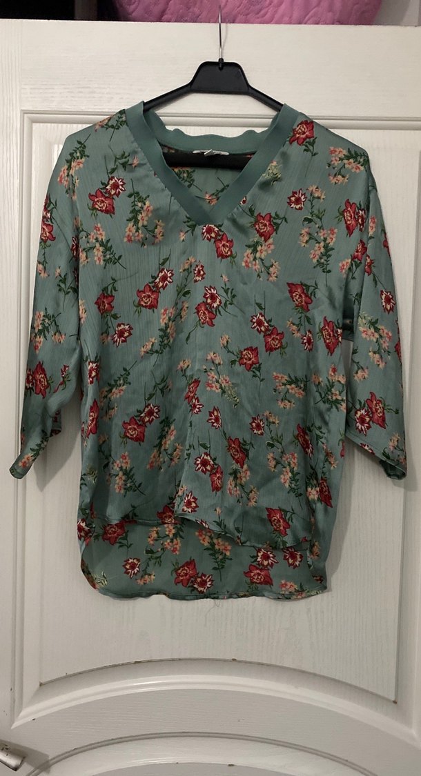 Bohem tarzda, düğmeli, V yakalı, uzun kollu, bol kesim, çiçek desenli turkuaz-gri bluz. Rahat ve günlük kullanıma uygun. Çiçekli enı 50 cm boyu60 cm