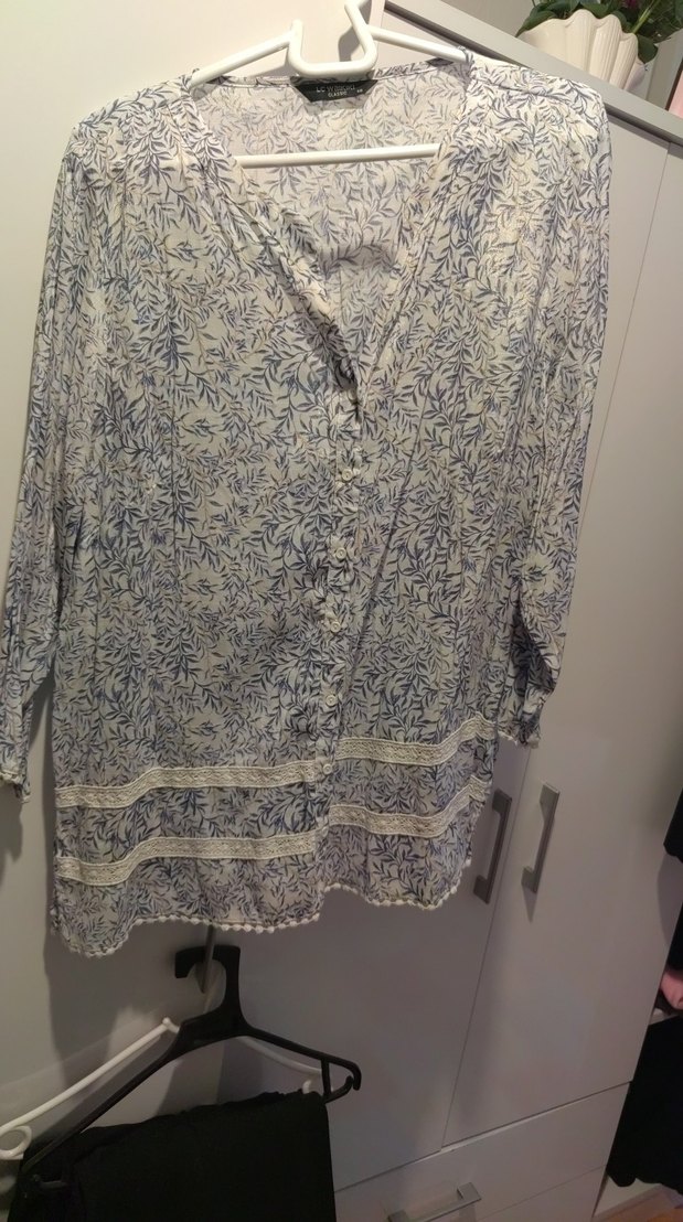 Bej renkte, koyu mavi tie-dye desenli, uzun kollu, V yakalı ve düğmeli bol kesim pamuklu kadın bluz. Günlük kullanıma uygun.