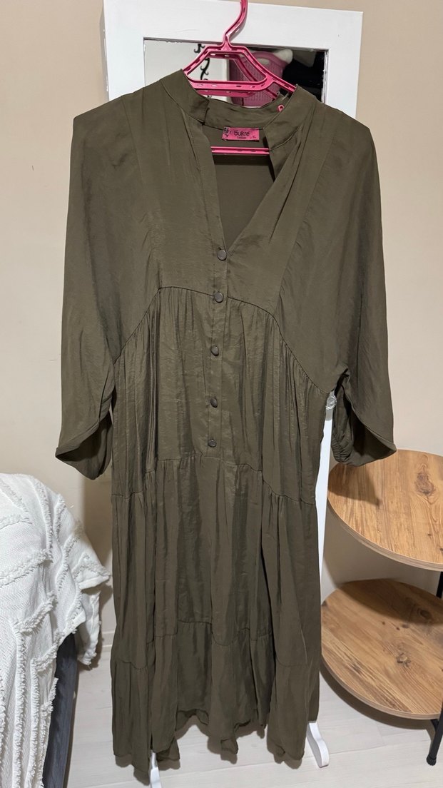 Uzun, bol kesim khaki gri keten hamile tunik, düğmeli ön ve V yakalı. Kısa kollu, bohem tarzda, günlük kullanıma uygun.