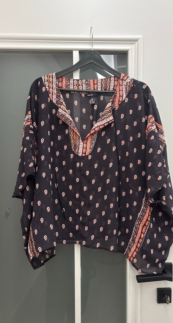Bohem tarzda, V yakalı, düğmeli, uzun kollu, yumuşak dokulu, koyu renkli çok renkli desenli kadın bluz. Defosu yok