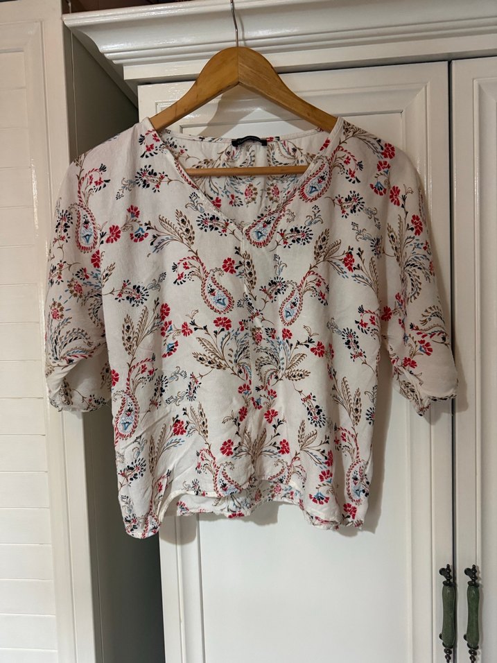 Bohem tarzda, düğmeli ön kısmı ve V yaka ile kısa kollu bol kesim bluz. Hafif pamuklu ve renkli baskılı desene sahip, günlük kullanım için uygun.