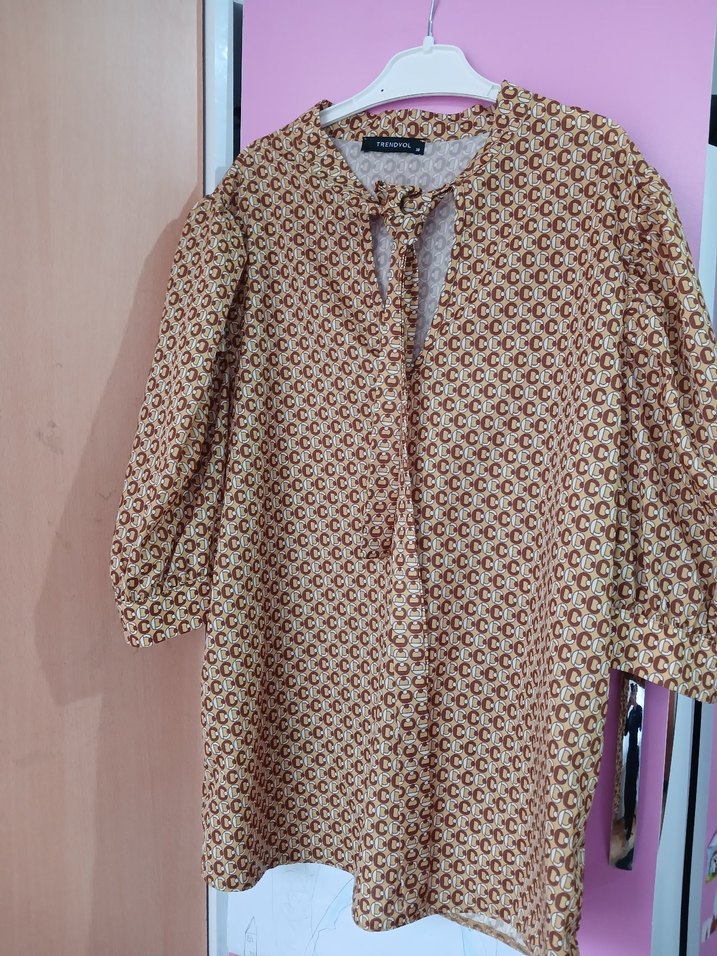 Bol kesim, uzun kollu, düğmeli pastel kahverengi tonlarında retro desenli. Bohem stil için uygun.