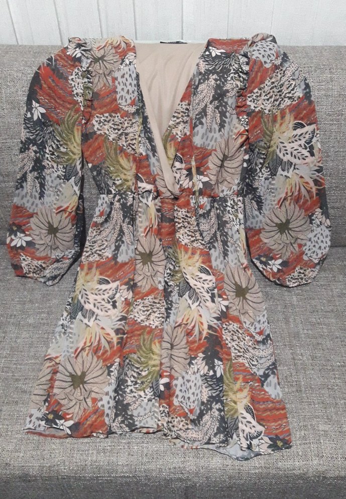 Kadınlar için bohem tarzda, düğmeli V yakalı, uzun kollu, bol kesim mini elbise. Canlı çok renkli batik desenli, açık hava için uygun. L beden içinde uygundur beli lastiklidir