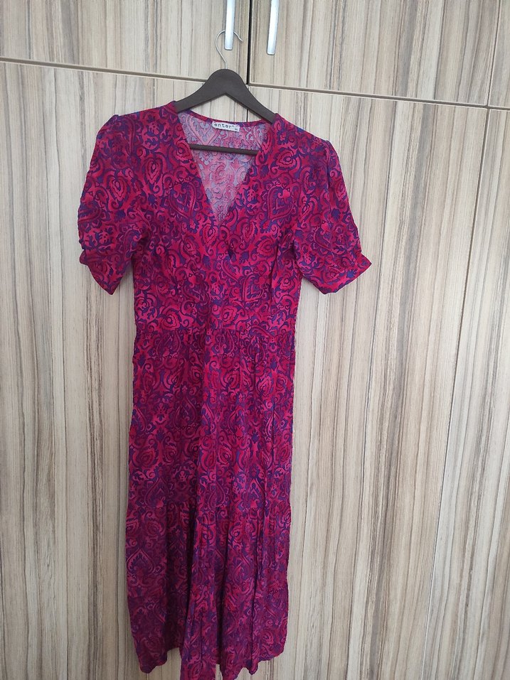 Canlı mor tonlarında, bohem tarzda uzun elbise. V yaka, kısa kollu, düğmeli ve bol kesimdir.Yeni gibi çok az giyildi.